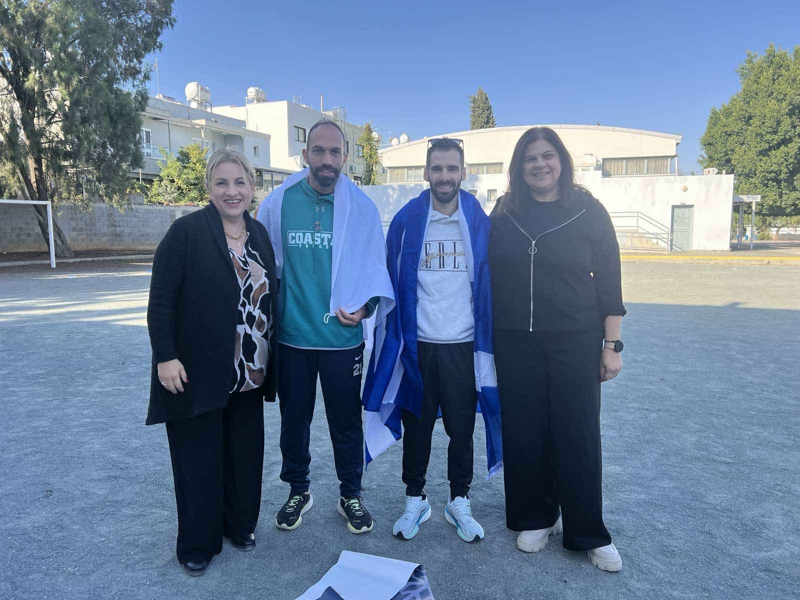 Σε μια σεμνή τελετή που ετοιμάσαμε για να τον τιμήσουμε, ο Παναγιώτης Καραΐσκος μαζί με τον Κύπριο πρωταθλητή μεγάλων αποστάσεων, Χριστόφορο Πρωτοπαπά, τερμάτισαν φτάνοντας τρέχοντας στη γραμμή τερματισμού και ακολούθησε η διαδικασία βράβευσης των αθλητών: κάπνισμα με καπνιστομέρρεχα, στεφάνωμα με στεφάνι από φύλλα δάφνης, ράντισμα με ροδόσταγμα, απονομή μεταλλίου. Ακολούθησε καλωσόριαμα από τις διευθύντριες του σχολείου και από τους μαθητές. Ο Παναγιώτης Καραΐσκος εξέφρασε τη χαρά του να βρίσκεται κοντά μας και η εκδήλωση ολοκληρώθηκε μετά από συζήτηση μαθητών και γονέων μαζί με τον Έλληνα αθλητή. Μαθητές των Γ' τάξεων και γονείς είχαν την ευκαιρία να θέσουν ερωτήσεις στον αθλητή και να πάρουν έμπνευση από το πείσμα, τη θέληση και την επιμονή του να πετύχει τους στόχους του.